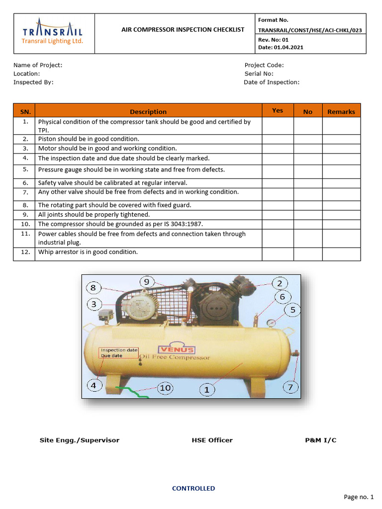 Air Compressor Inspection Checklist Global EHS 029 | PDF | Personal ...