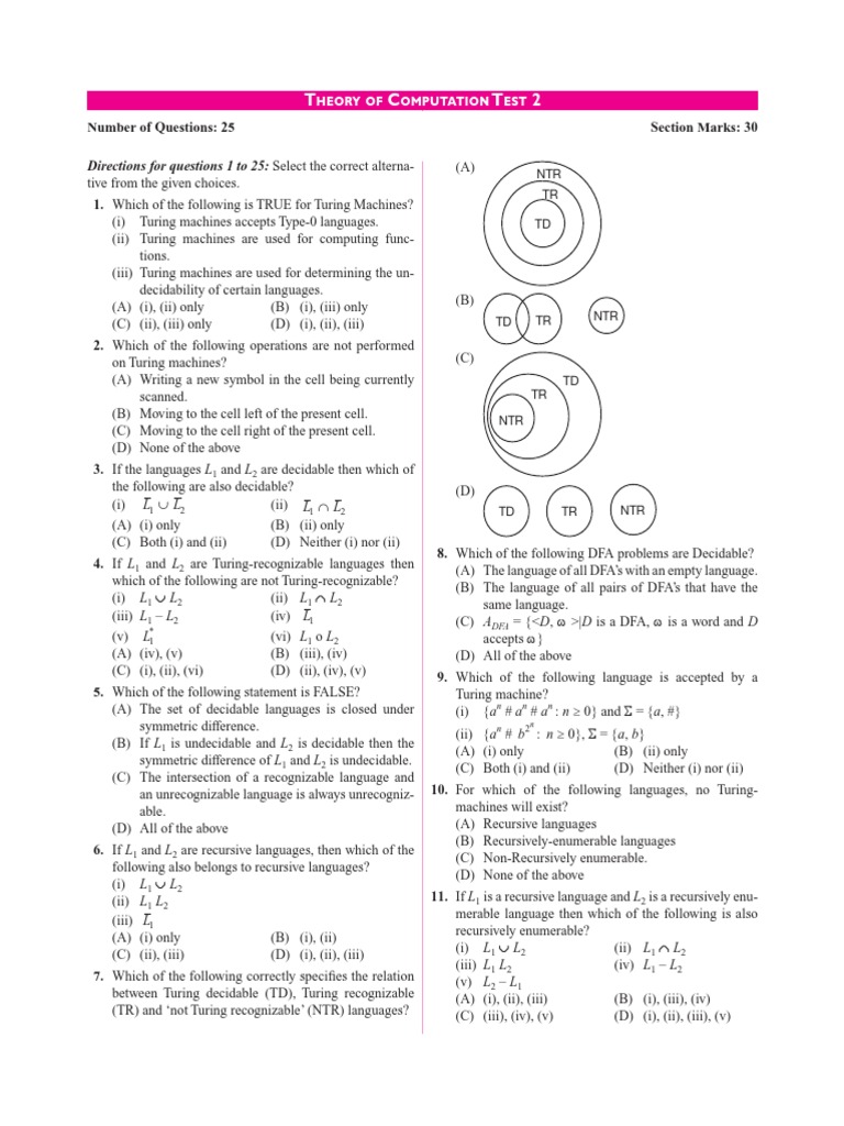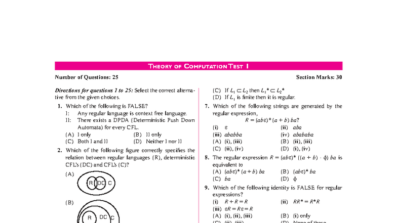 Theory of Computation Test 2: Number of Questions: 25 Section Marks: 30 ...