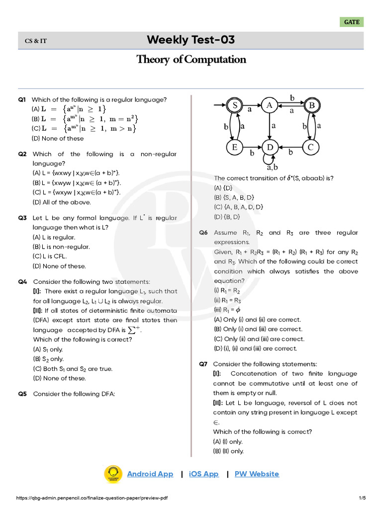 Theory of Computation Weekly Test 03 Test Paper °UNLO | PDF | Theory Of ...