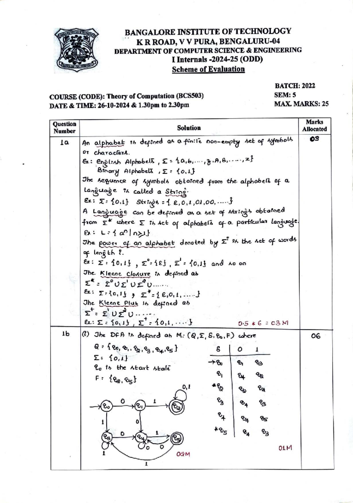 BCS503 Theory of Computation Test 1 Scheme 2024-25 - Studocu