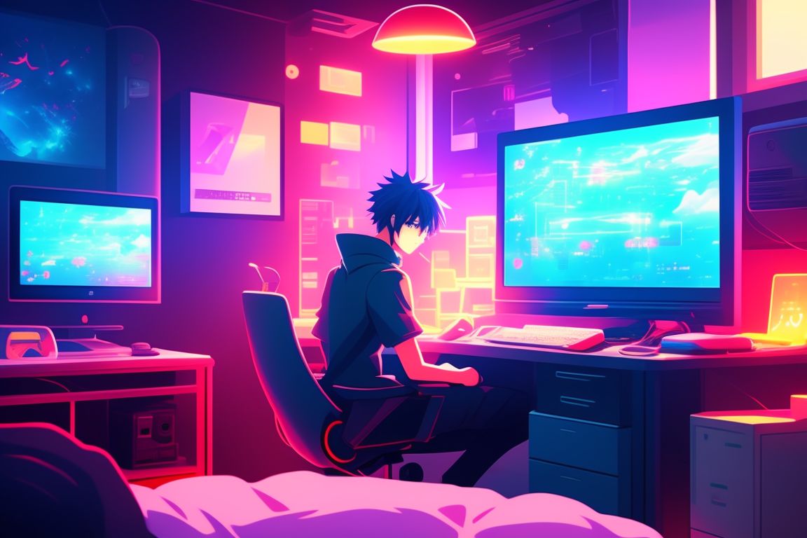 Anime Boy and Computer in Dark Ambient Room · Creative Fabrica