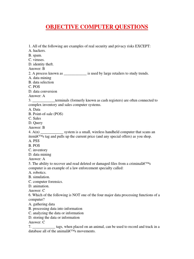 Interactive Computer Basic Objective Questions & Answers | Course Hero