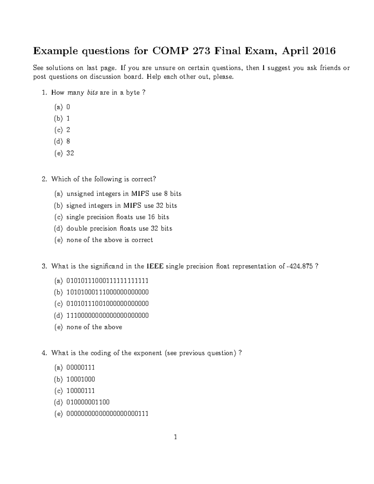 COMP 273 Final Exam Practice Questions and Solutions, April 2016 - Studocu