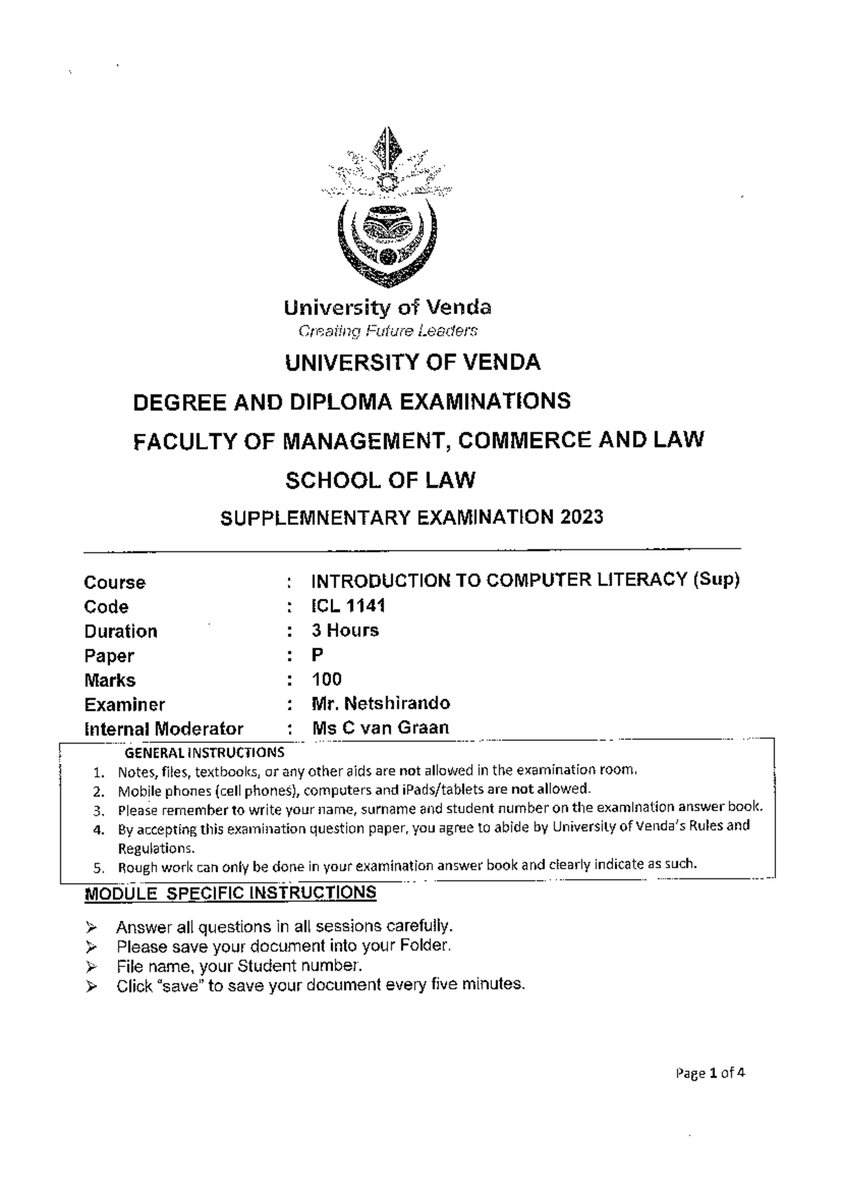 ICL 1141 Supplementary Exam 2023: Introduction to Computer Literacy ...