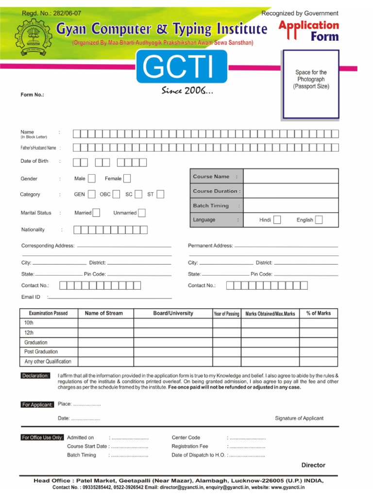 Computer Institute Admission Form Format
