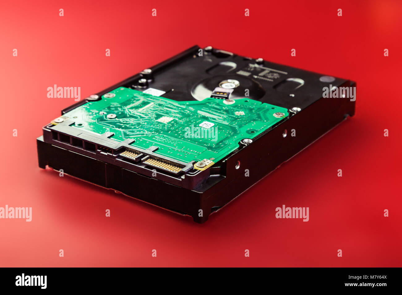 Computer hard drive on a red background. Computer storage technologies ...