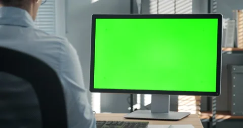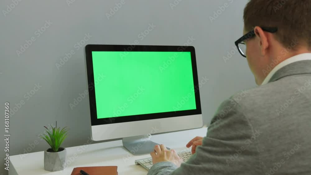 Back view of business man in the glasses working on computer with green ...