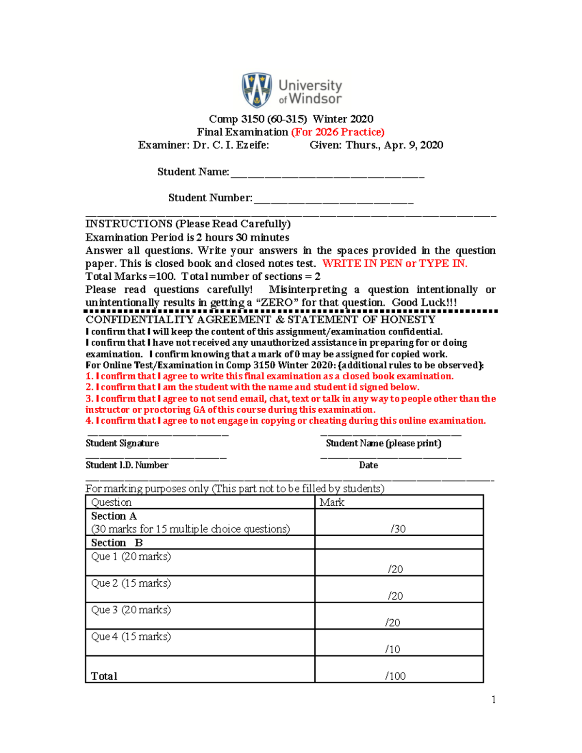 Comp 3150 Winter 2020 Final Exam Practice Questions and Solutions - Studocu
