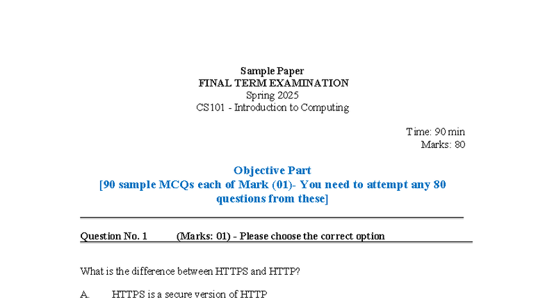 CS101 Sample Paper (Final) - Computer science - VU - Studocu
