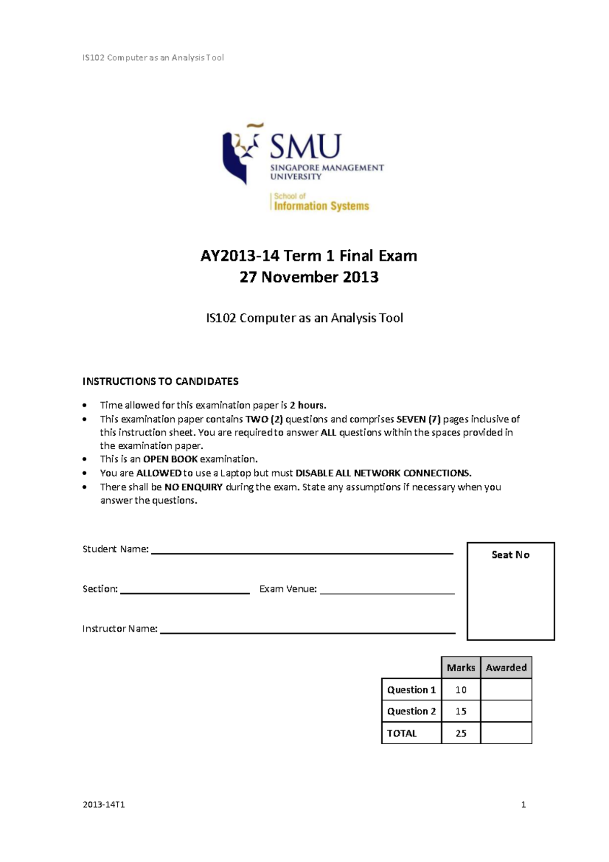 IS102 Computer as an Analysis Tool Term 1 Final Exam Sample 2013-14 ...