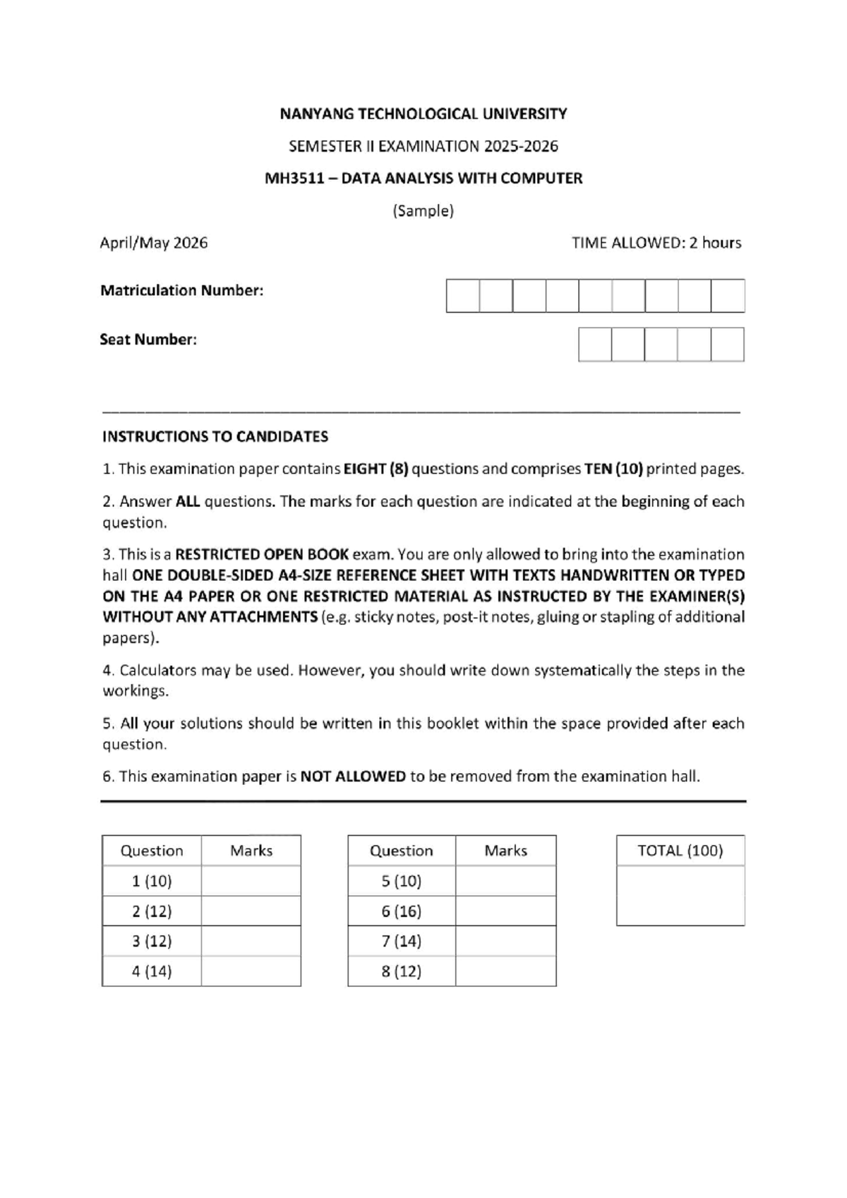 MH3511 Final Exam 2026: Data Analysis with Computer Sample Paper - Studocu