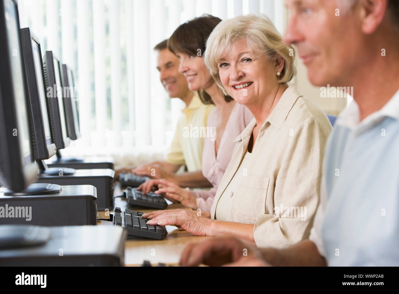 Four people in computer room typing and smiling Stock Photo - Alamy