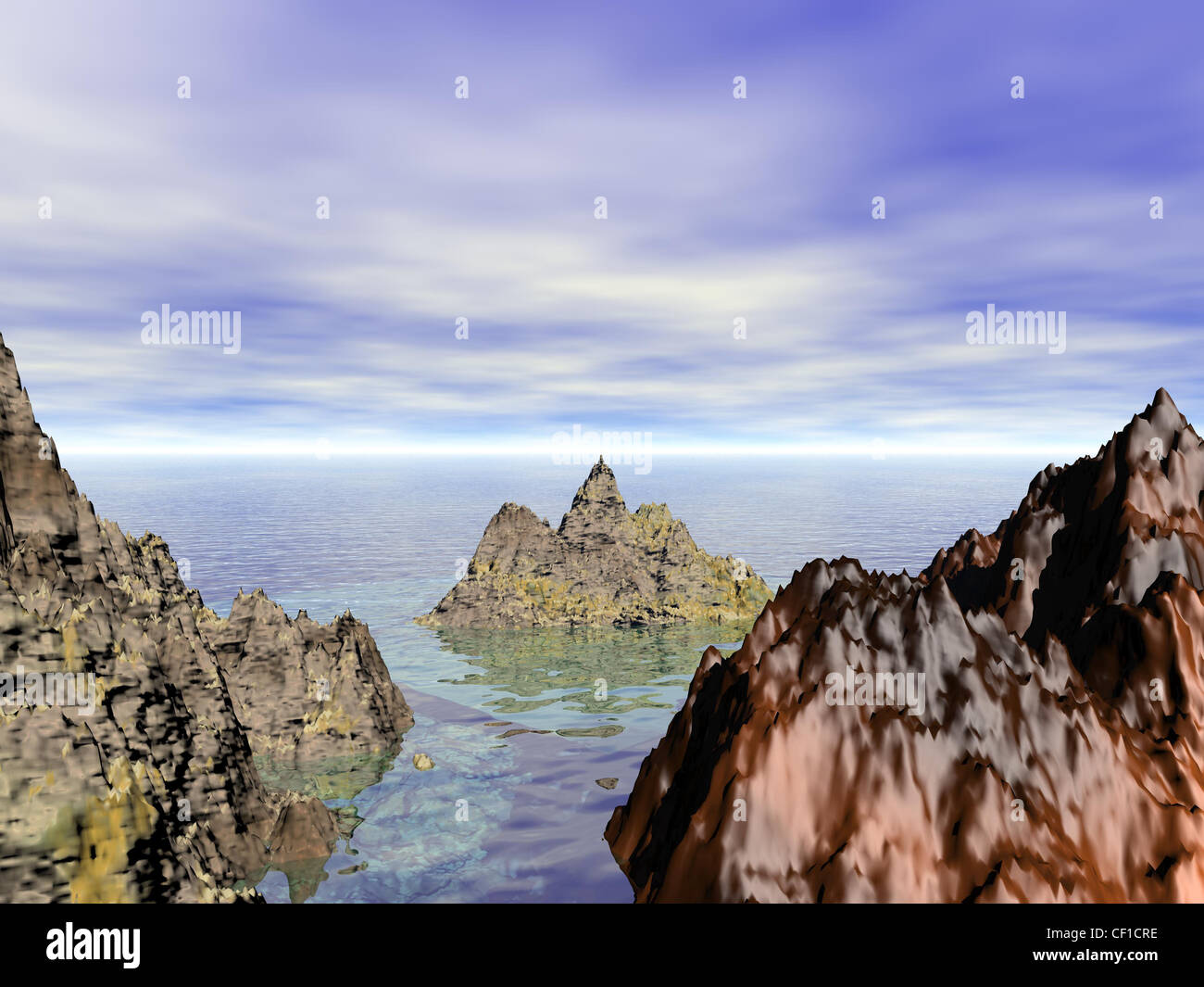 Abstract 3d rendering of computer generated landscape with mountains ...