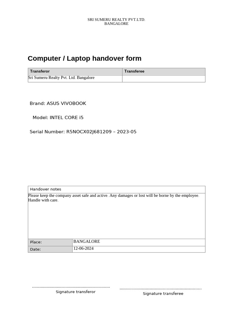 Laptop Handover Form Template | PDF