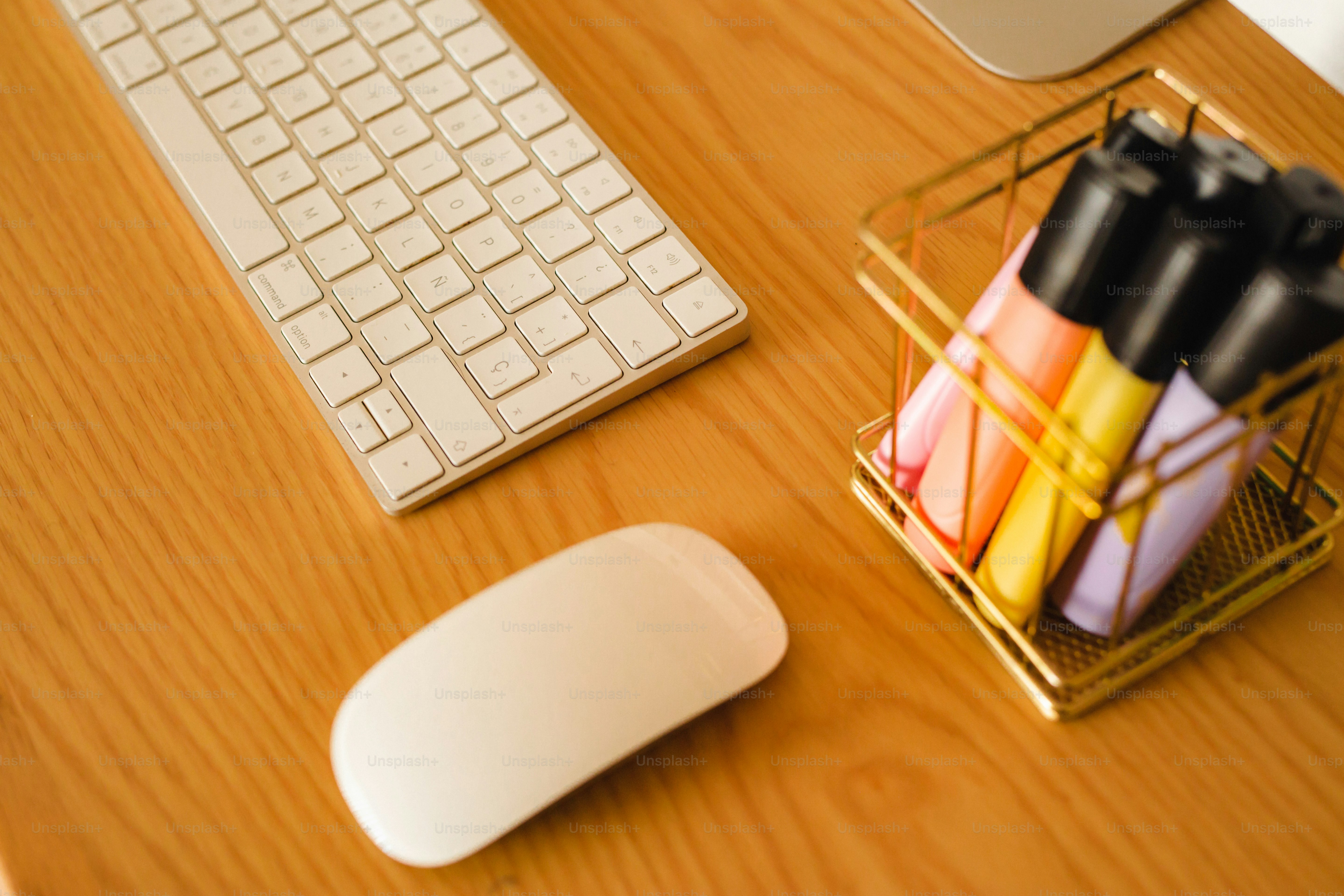 A desk with a computer keyboard, mouse and pens photo – Highlighter ...