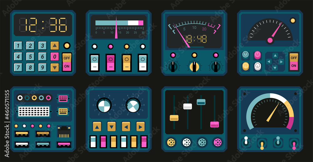 Retro dashboard. Control panel dial, switch, knob buttons. Spaceship ...