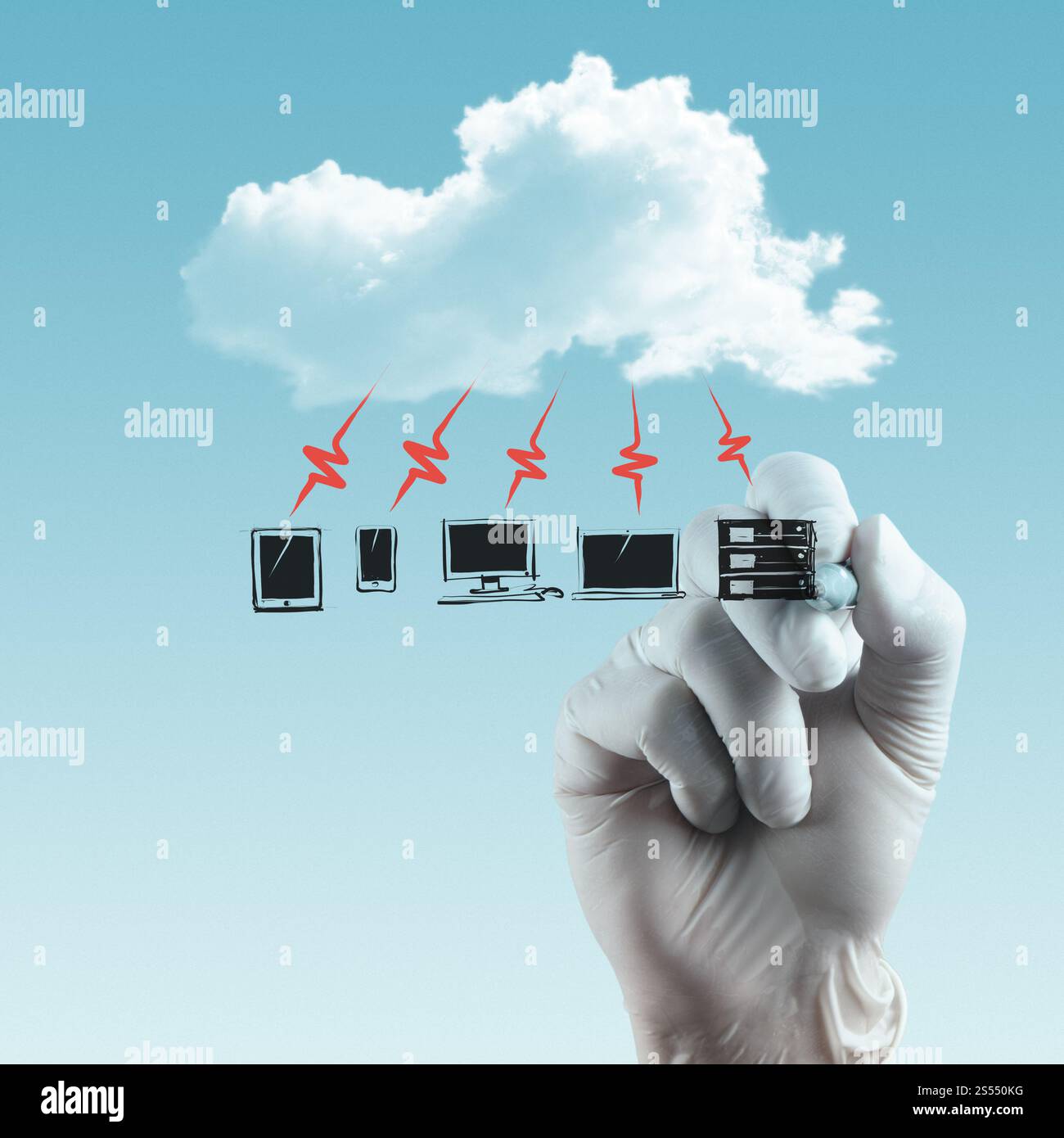 technician hand drawing a Cloud Computing diagram on the new computer ...