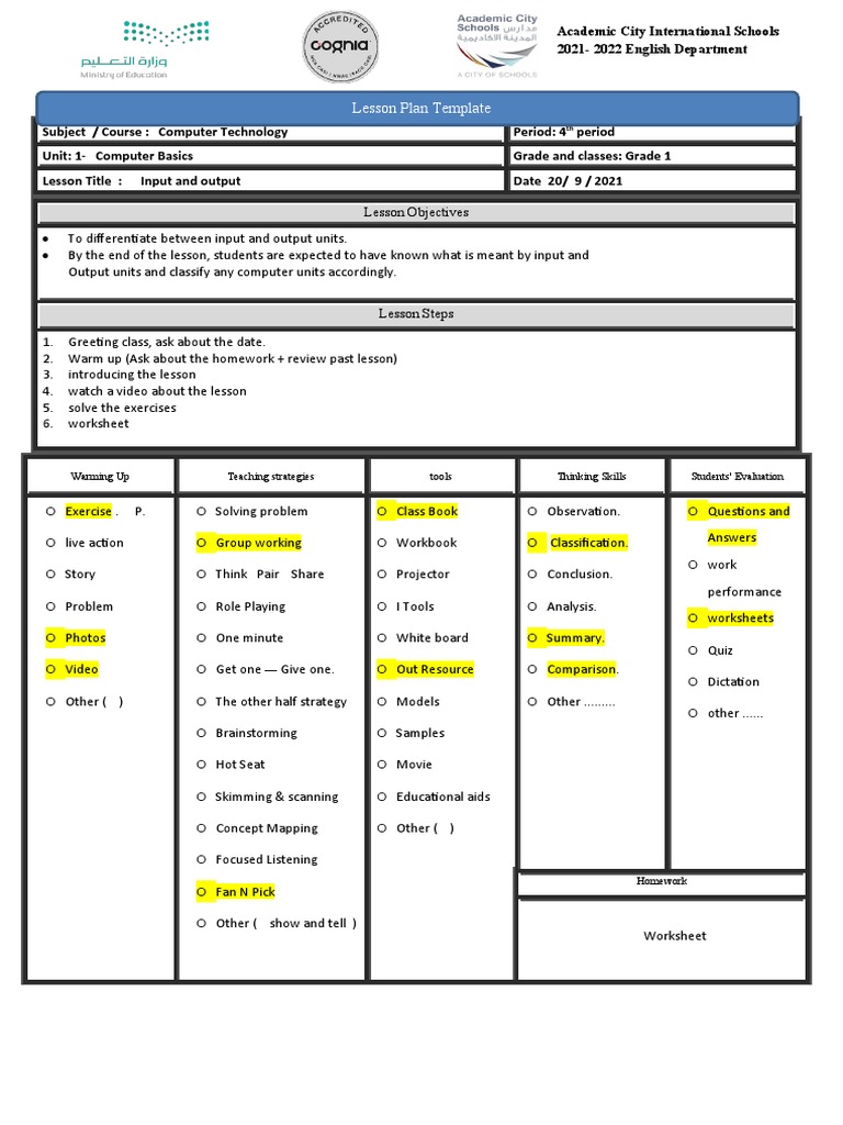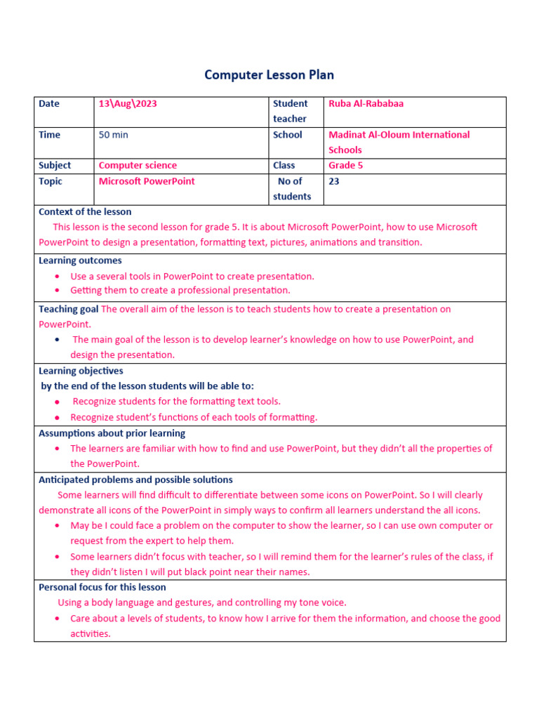 Computer lesson plan form 1 2 3 4 sample - wa/12zftz TEACHERS - Studocu