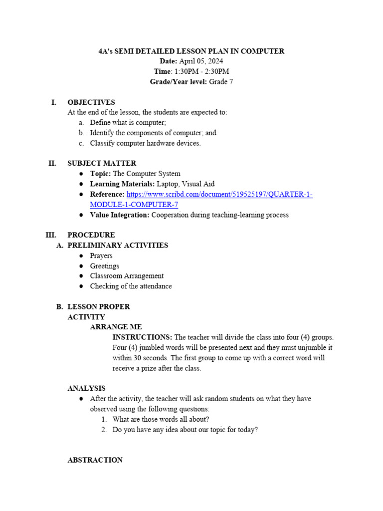 LESSON PLAN - 2nd Week - Computer | PDF | Lesson Plan | Abstraction ...