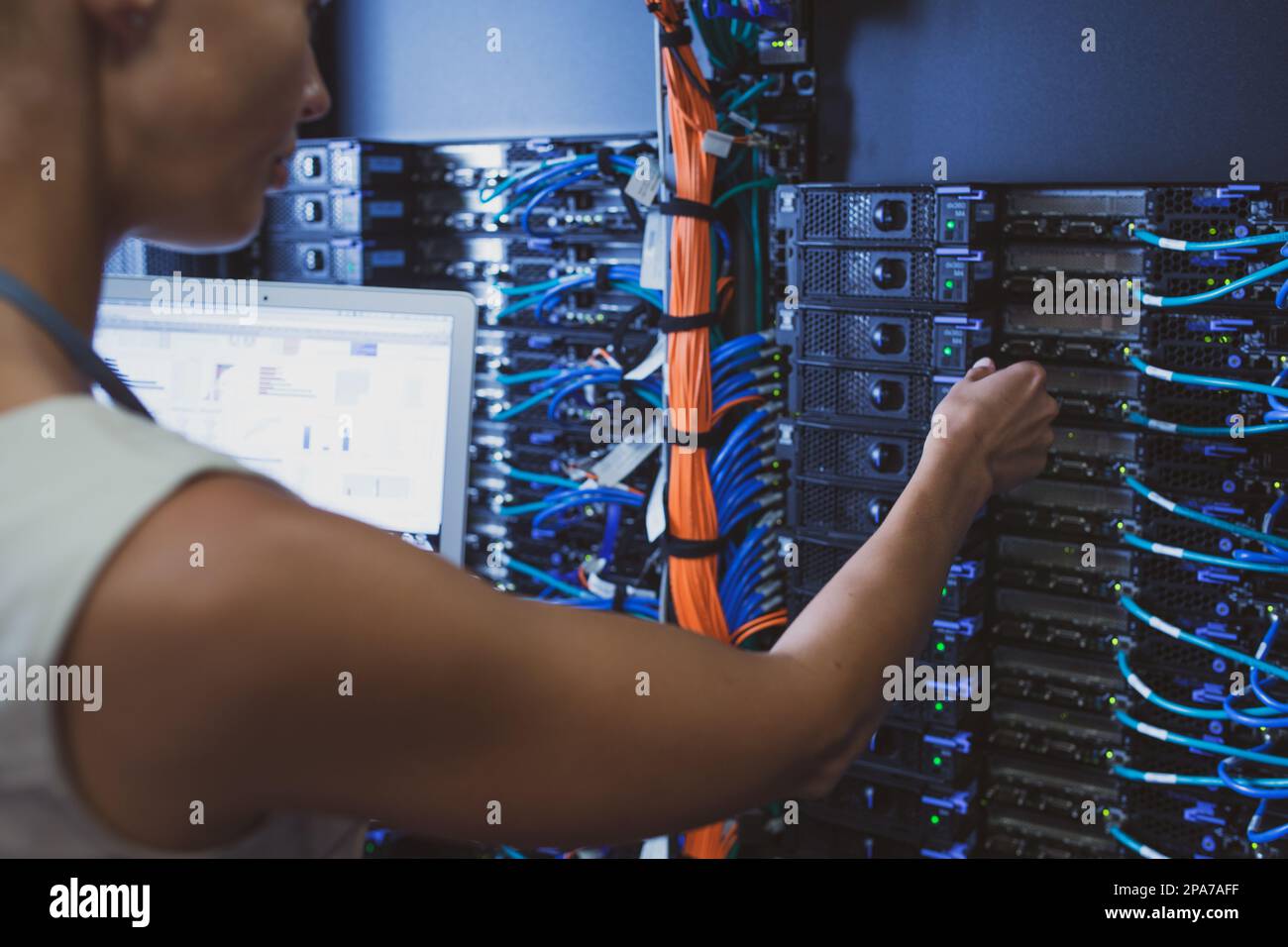 Technician performing maintenance tasks in a server room rack Stock ...