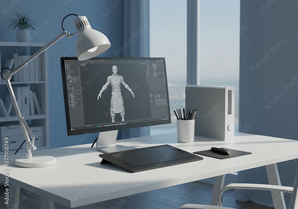 3D character modeling workspace with computer, graphics tablet, and ...