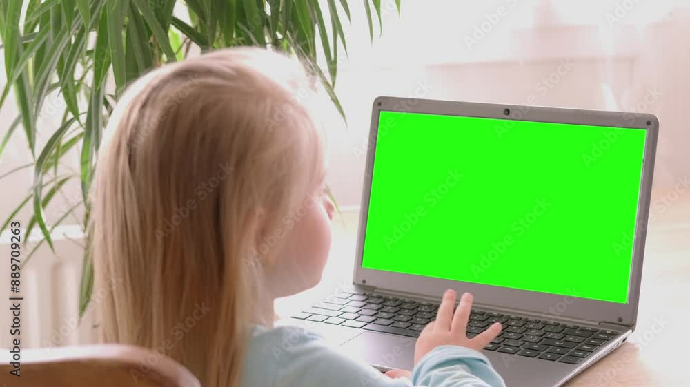 monitor with green screen for video, child, 5-year-old girl, sits front ...