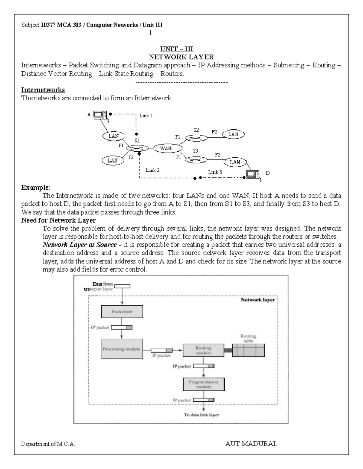 Subject:10377 MCA 303 Computer Networks Unit 1-3: Network Layer ...