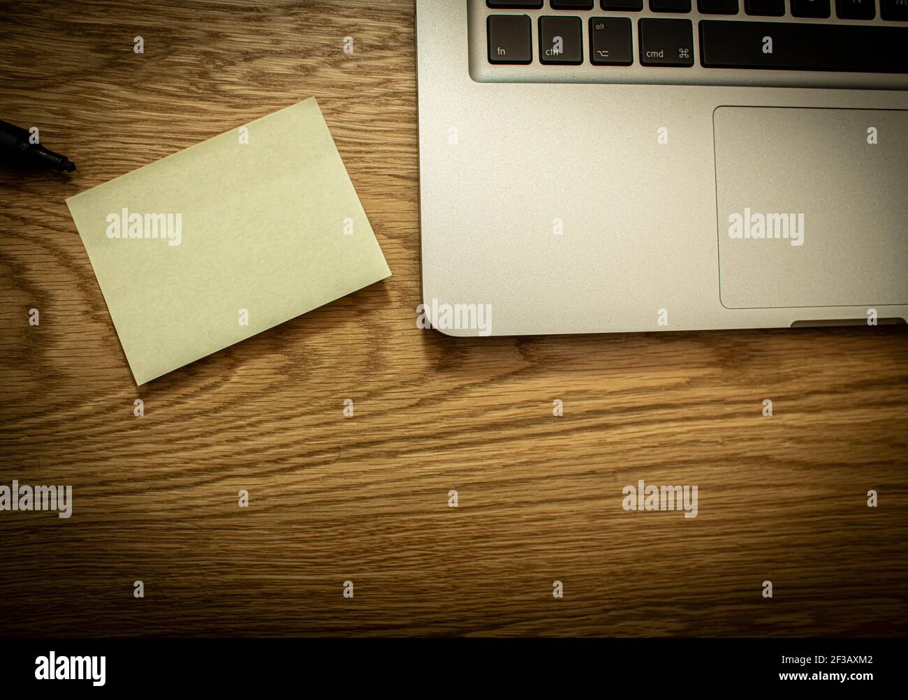Laptop computer with blank post it note and pen on wooden table. Blank ...