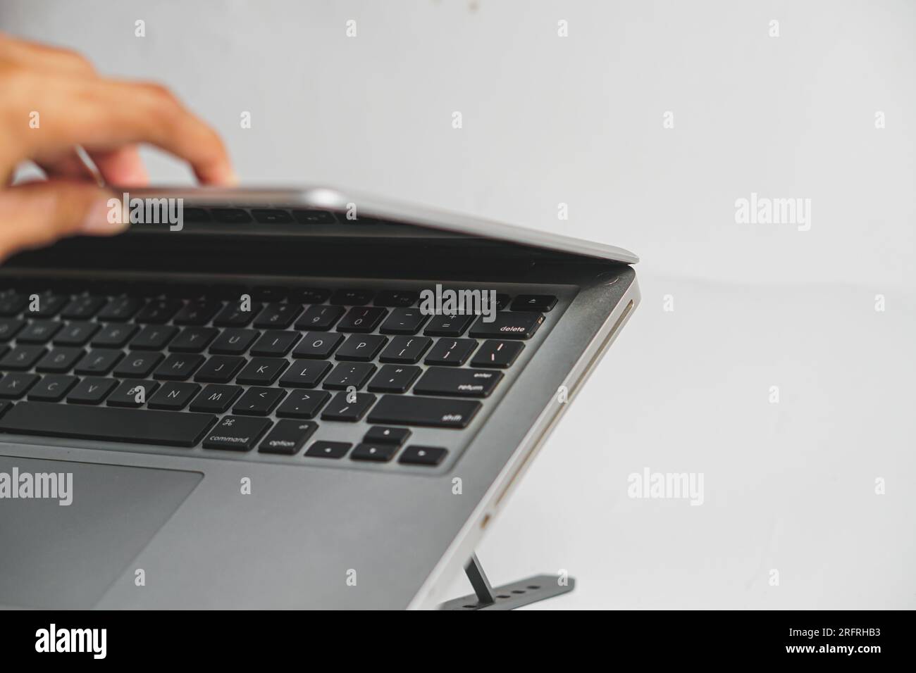 opening a laptop computer, getting ready for work in office Stock Photo ...