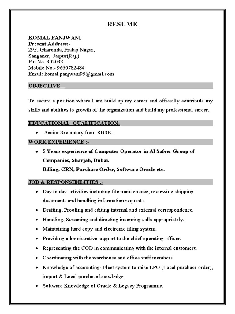 Resume format for Computer Operator Job Computer Operator Resume Sample ...