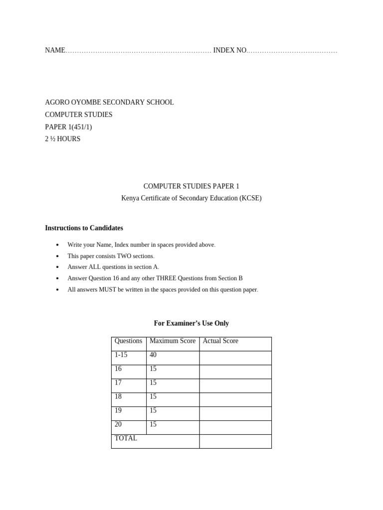 Computer Studies 451/1 Form 2 End Term 2 Exam Questions - Studocu