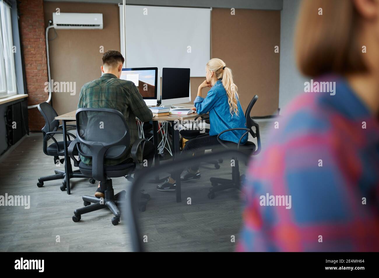 Back View of People Sitting at Table Working on Computers Stock Photo ...