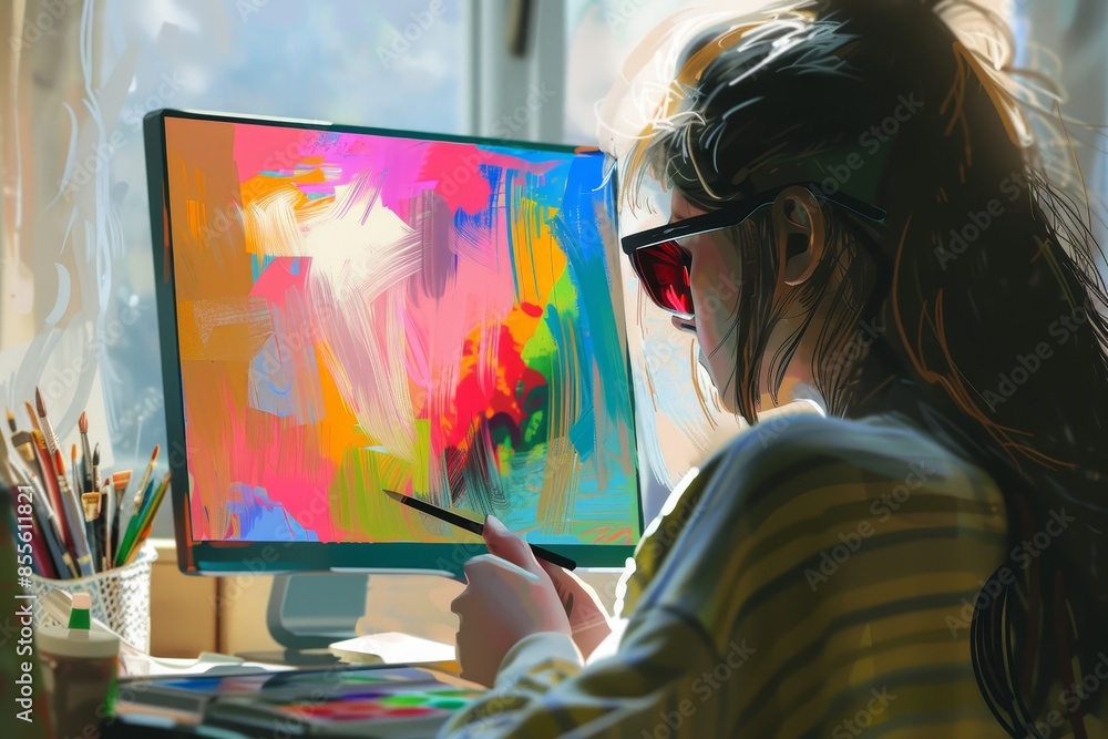 A woman is using a computer to paint a picture, experiment with color ...