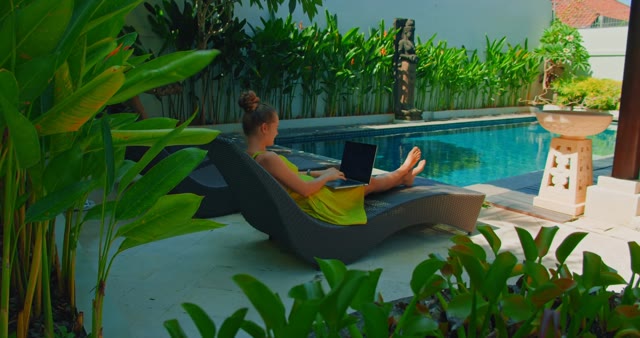 Premium Photo | Woman using laptop computer by the pool