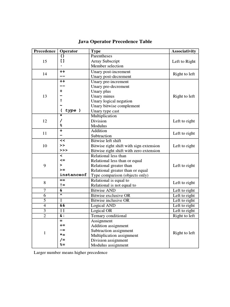 Operator Precedence Table - Computer Science: Java | CSE 8A - Docsity