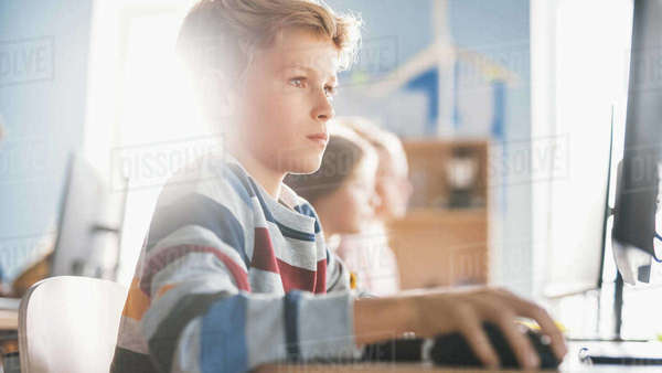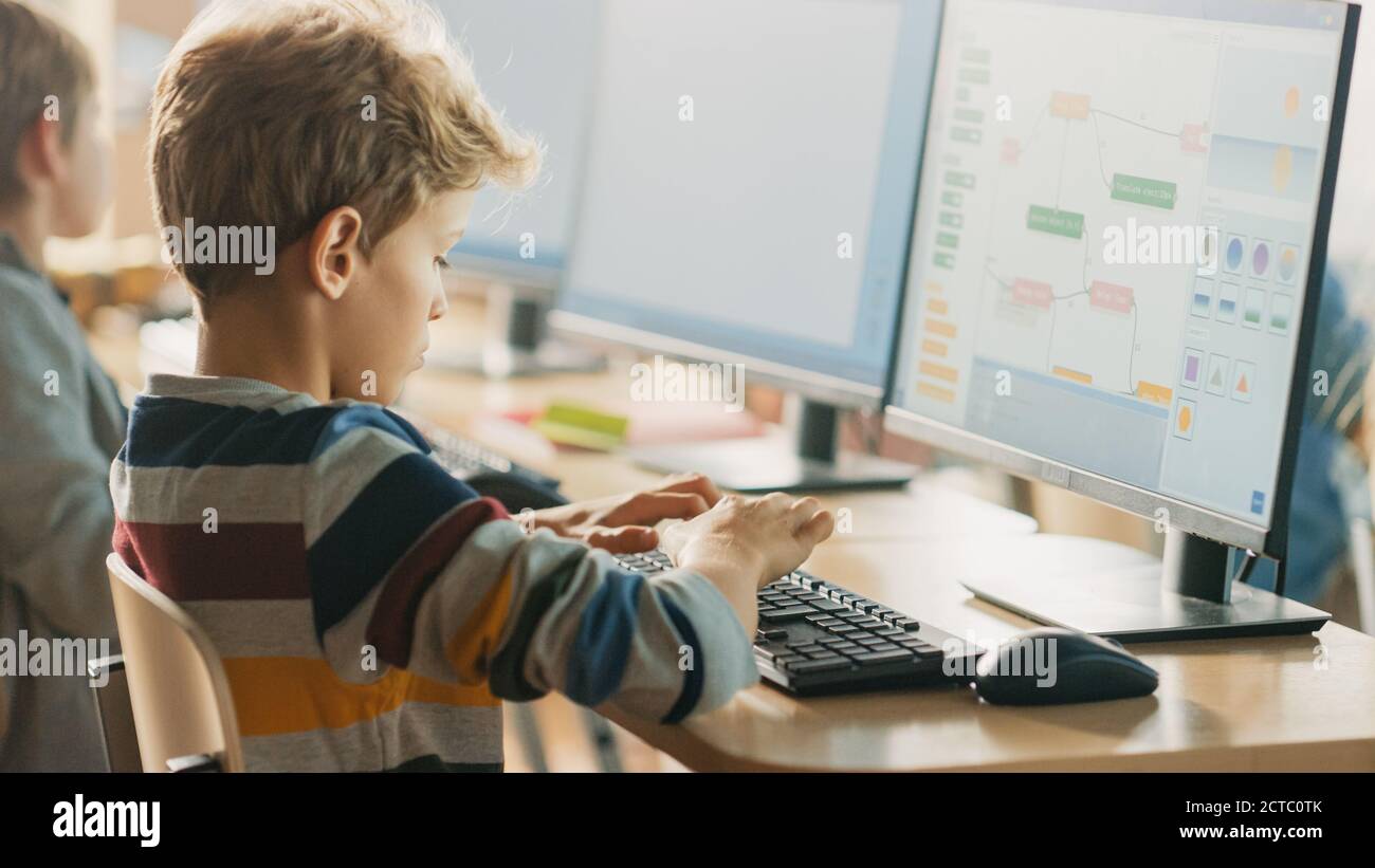 Elementary School Computer Science Classroom Smart Little Boy Uses ...