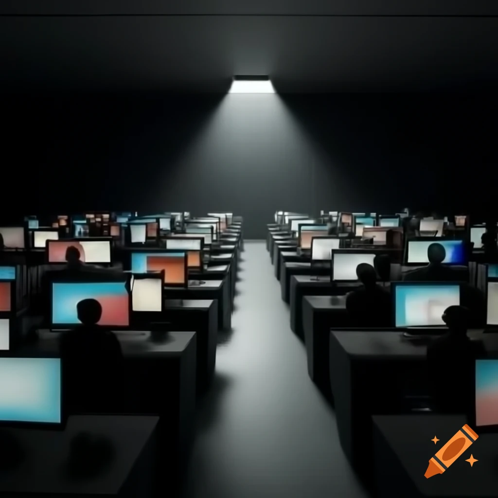 Room filled with computers illuminated by spotlight in shadow on Craiyon
