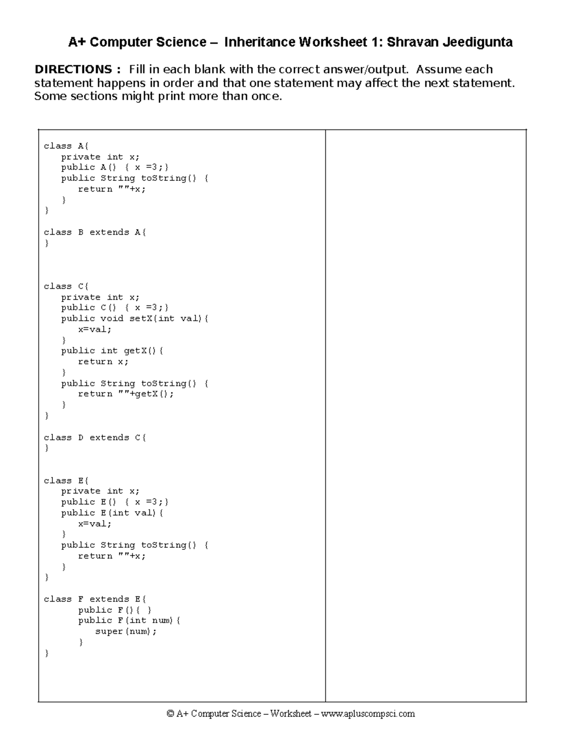 Inheritance and Polymorphism Worksheet #1 for A+ Computer Science - Studocu