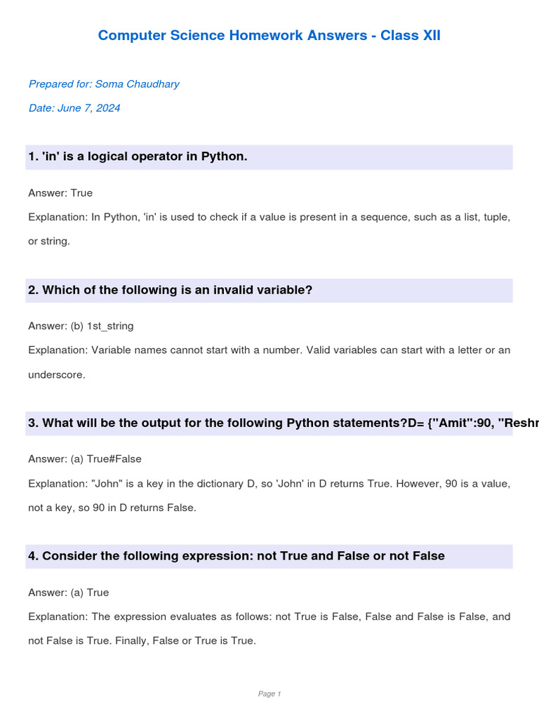 Computer Science: Computer Science Assignment 1 to 4 (Class-12)