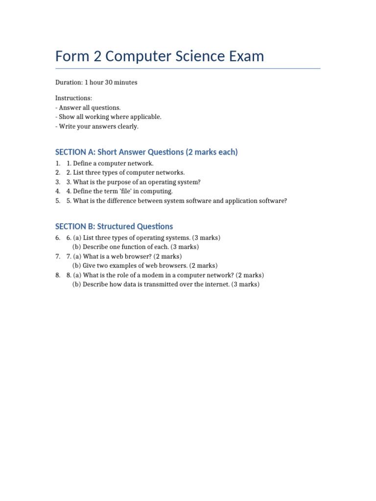 Form 2 Computer Science Exam | PDF