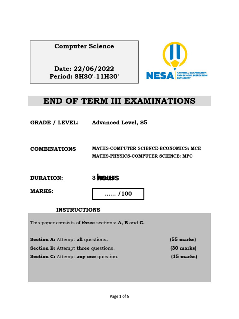 COMPUTER SCIENCE S5 END OF TERM III 2024 NESA EXAMINATIONS QUESTION AND ...