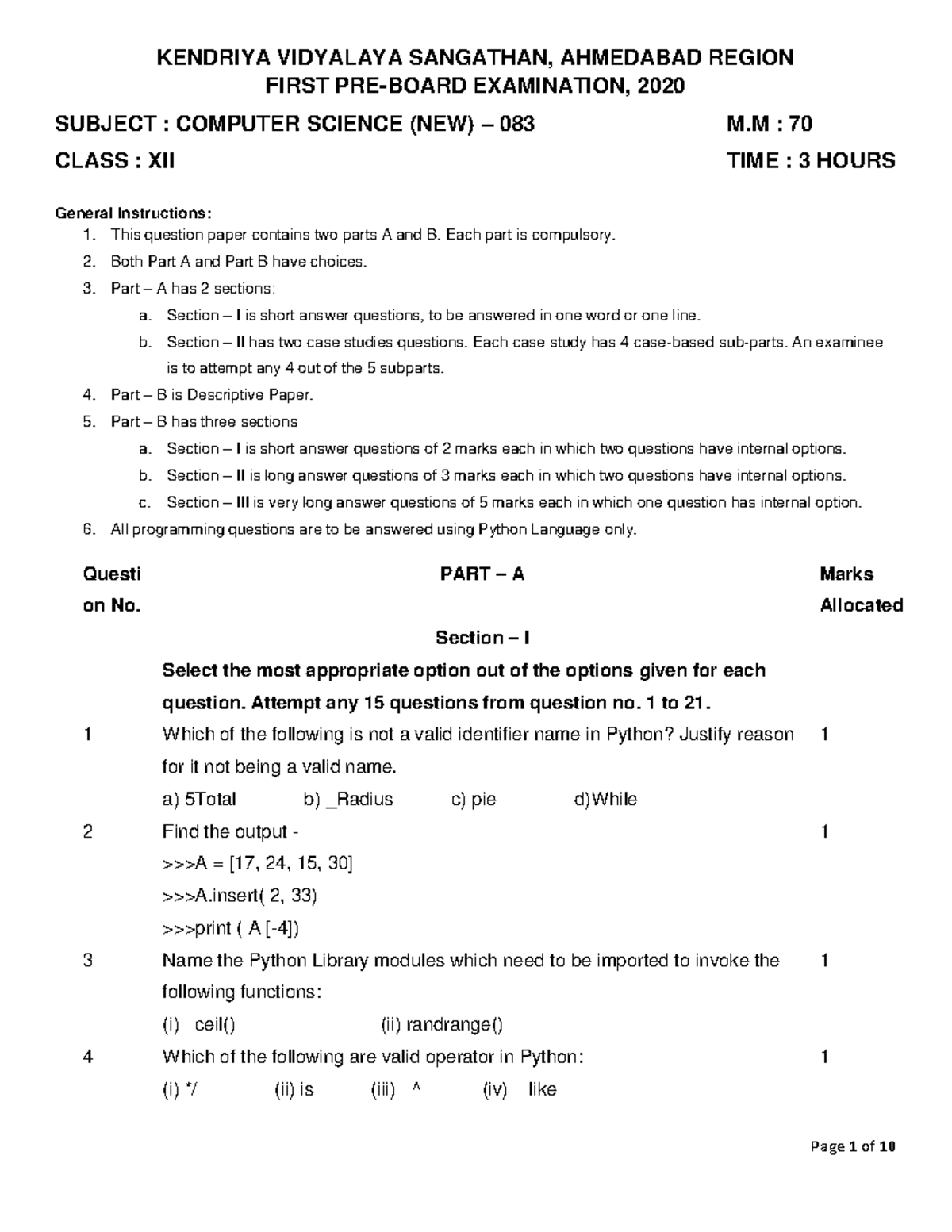 Computer Science Class XII Pre-Board Exam 2020 (Subject Code 083) - Studocu