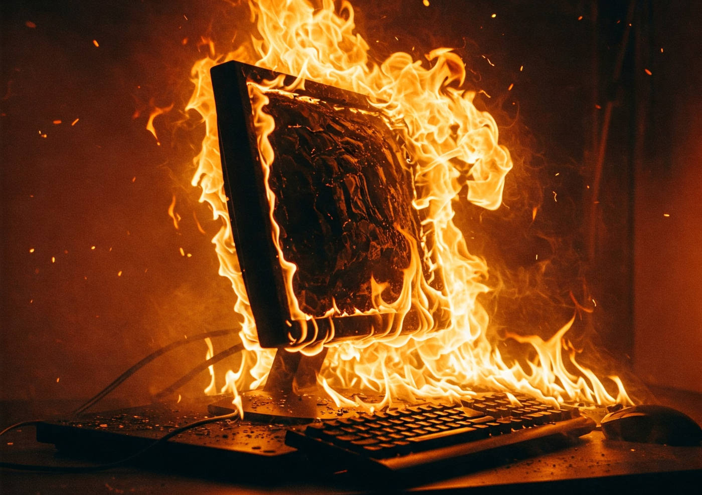 Digital Meltdown A computer explodes in a fiery inferno on a wooden ...