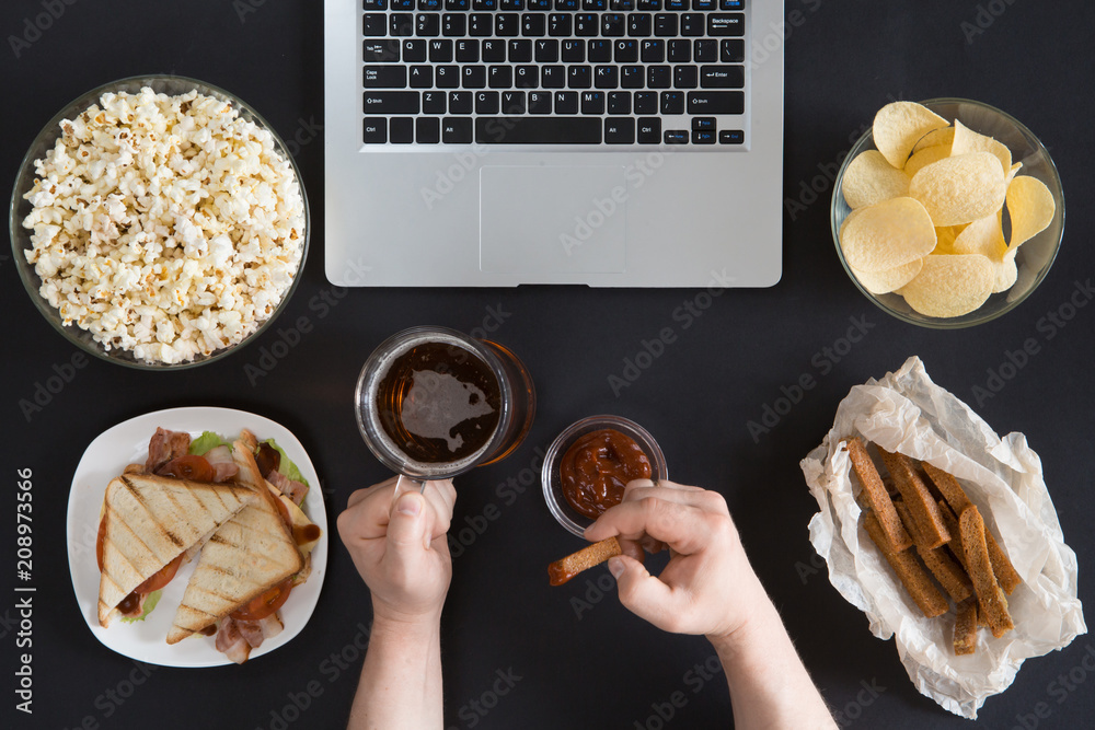 Premium Photo | Top view of snacks and unhealthy food with laptop on ...