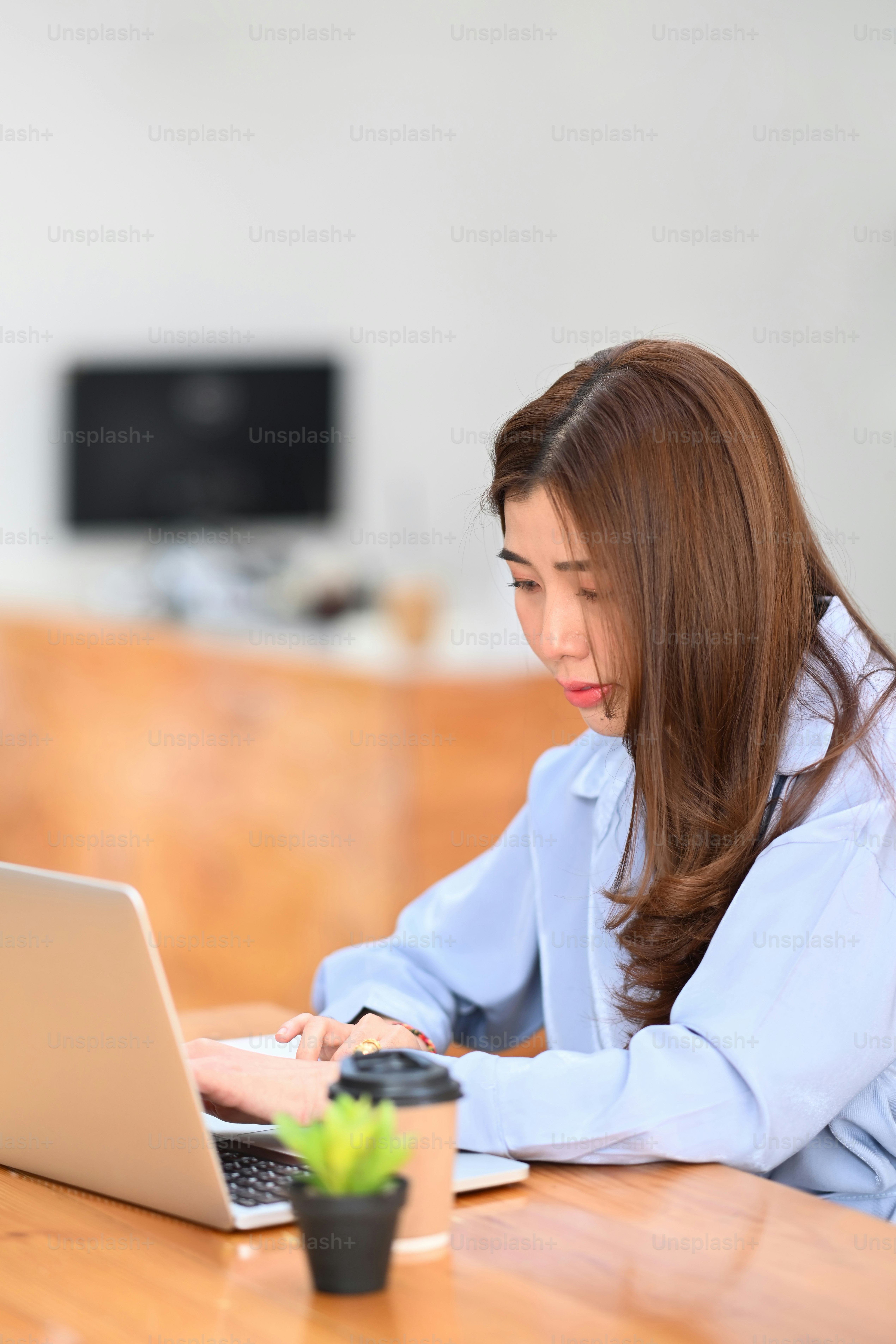 Portrait of young female freelancer working with computer laptop on ...