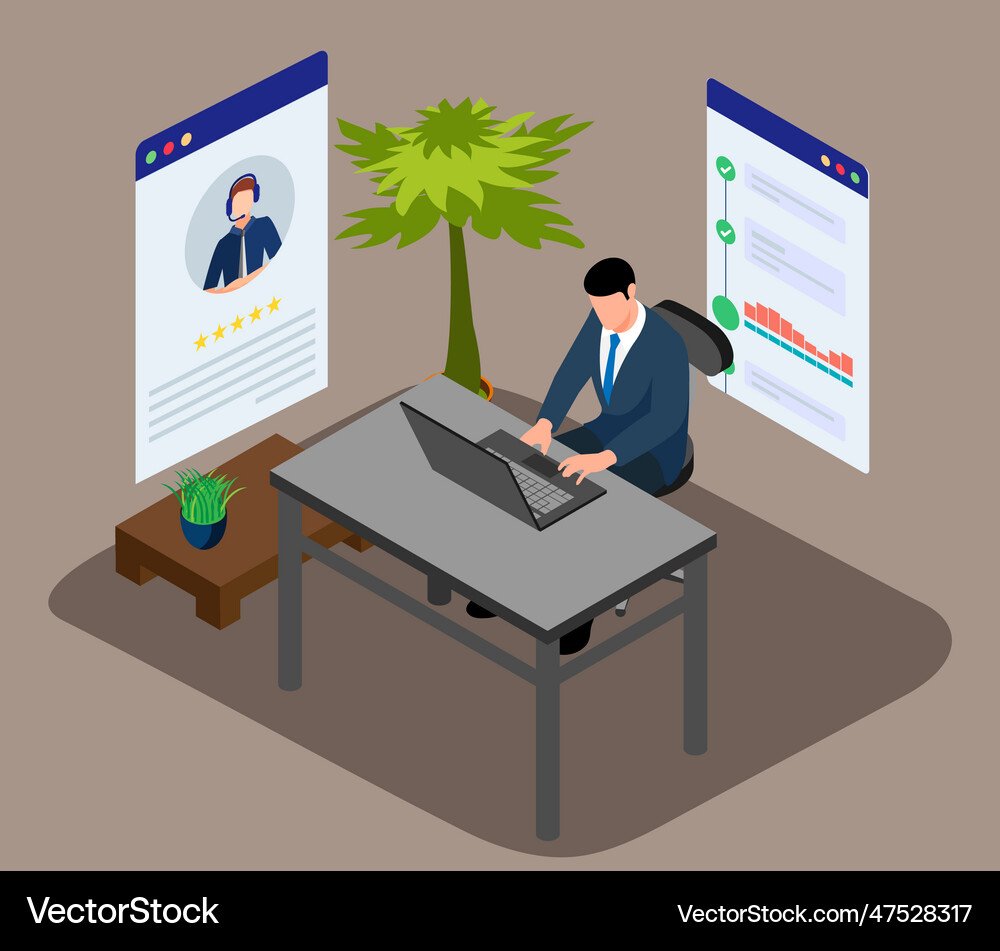 Man working with computer at desk 4578793 Vector Art at Vecteezy