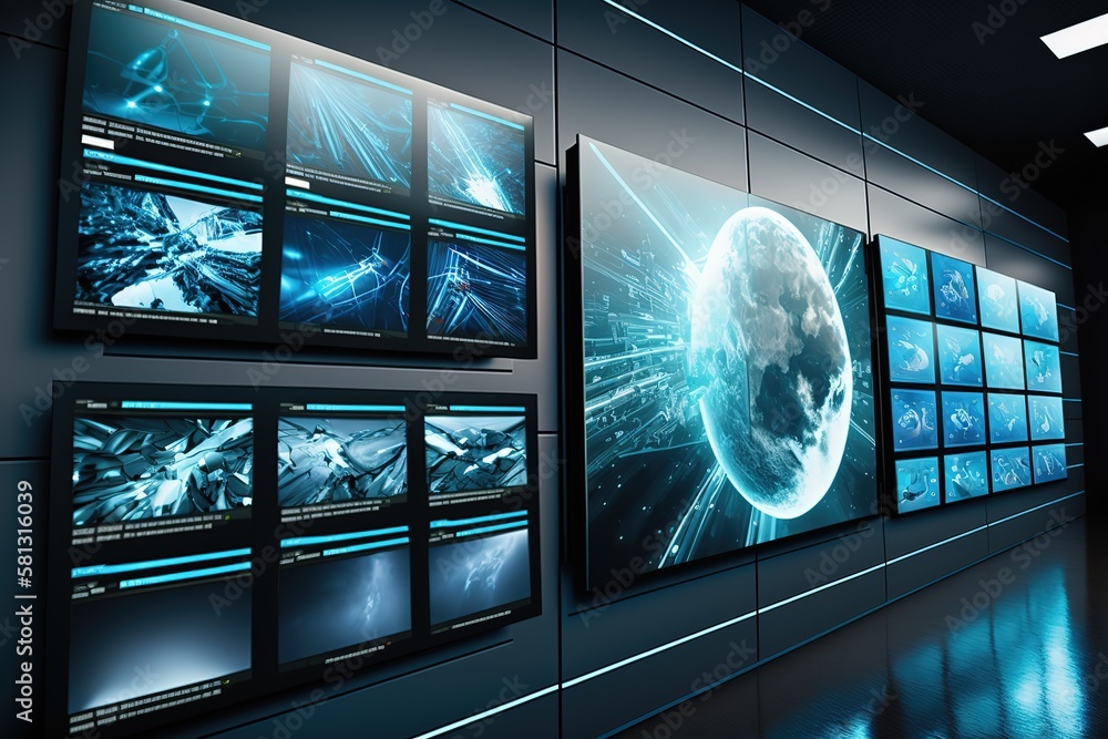 Video wall. Video screens showing multiple technology themed. Stock ...
