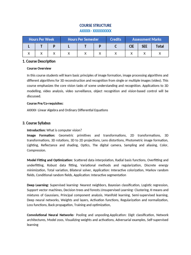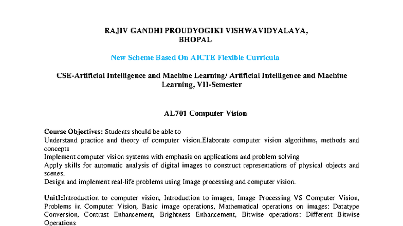 AL701 Computer Vision: Course Syllabus and Objectives - Studocu