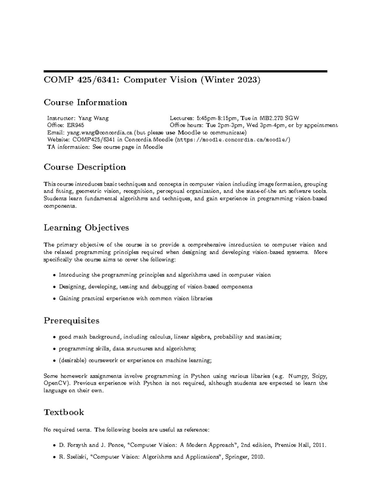 COMP 425/6341: Computer Vision Course Syllabus - Winter 2023 - Studocu