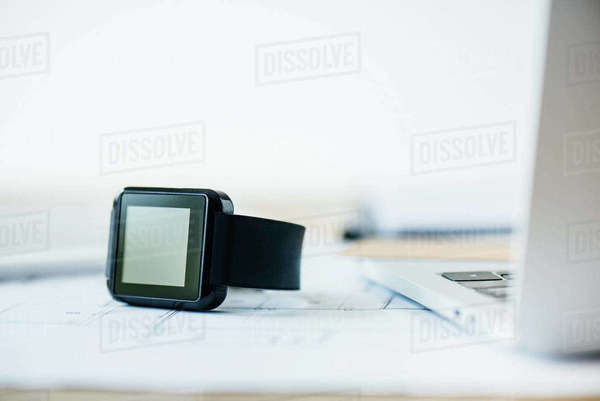 close-up view of smartwatch and laptop at workplace - Stock Photo ...